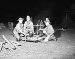 The fun and skill of Boy Schouts were displayed Starday nighta at the Scout Circus in Farrington Field. Boy Scout Troop 161 of Euless, Texas, cooks around a campfire. From left to right, Life Scouts Perry King and Jack Mayfield, and First Class Scout Johnny Eden kneel on the grass around the fire. The boys are wearing their scout uniforms. Published in the Fort Worth Star-Telegram morning edition, May 5, 1946.