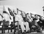 A memorial service was held at John Tarleton Agricultural College to honor the school's war dead. Sitting at the speakers' platform, from left to right, are General Walter Krueger, former commander of the 6th Army and the principal speaker, E. J. Howell, the school's dean, Earl Rudder, mayor of Brady, Texas, and president of the ex-students association, and Reverand E. L. Miley of Stephenville, Texas, who gave the invocation. Behind them is the American flag and flags of other nations. Published in the Fort Worth Star-Telegram morning edition, May 6, 1946.