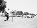 J. H. Brinkley making a putt at the Texas State Amateur golf tournament. Bill Skeeters is the umpire, holding the pin on the No. 2 hole. Behind Mr. Brinkley is a crowd of spectators. Published in the Fort Worth Star-Telegram evening edition, May 6, 1946.