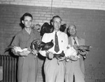 Fort Worth Bantam Club. Show. Left to right, George Griffin, A. E. Johnson and J. F. Russell, shown with prize birds. Mr. Griffin, Mr. Johnson and Mr. Russell standing next to each other holding chickens and roosters. Two of the men have birds perched on their shoulders.