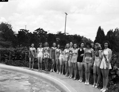 The young women chosen to represent their respective cities at the Texas Health and Beauty Festival at Mineral Wells, Texas, were, left to right, Billybob Newburn, of Jacksonville, Texas, Hortense Till, of Overton, Texas, Helen Louise Westbrook, of Fort Worth, Texas, Dolores Nicholas, of Galveston, Texas, Mary Frances Glass, of Sweetwater, Texas, Loleta Early, of Lubbock, Texas, Charlotte La Rue Allison, of Grapevine, Texas, Emmett Temple, of Seymour, Texas, Raba Wood, of Weatherford, Texas, D. Ouida Knox, of Graham, Texas, Gean Fox, of Cisco, Texas, Dorothy Henry, of Ranger, Texas, and Johnnie Lou Hart, of Eastland, Texas. They are standing in a line next to the swimming pool at the Baker Hotel, all wearing swimsuits. Miss Newburn is wearing a "Miss Jacksonville" sash over her swimsuit. Miss Early is wearing a "Miss Lubbock" sash over her swimsuit. Miss Hart is wearing a "Miss Eastland" sash over her swimsuit.