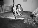 Nancy Nelson, two-and-a-half-year-old, and her grandmother, Mrs. W. R. Jordan, prepare the Oak Lawn Garden Club's exhibit in the Fort Worth, Texas Citywide Flower Show, which will take place in Will Rogers Memorial Coliseum. Mrs. Jordan is the chairman of the Oak Lawn club's show committee. Miss Nelson is holding a broom and is wearing a striped dress. Mrs. Jordan is wearing a blouse and cardigan and has on gardening gloves. To the left is a picket fence. Published in the Fort Worth Star-Telegram evening edition, May 9, 1946.