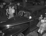 Mrs. Joe P. Henry shows her daughter, Carol Ann, four years old, the damaged Station Wagon belonging to her father, Joe P. Henry. The car was bombed with dynamite early Tuesday. Carol Ann was asleep 30 feet from the explosion scene at their home. There is a crowd of people standing around the 1941 model Station Wagon, examining the damage.