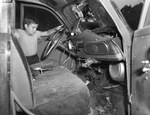 A 1941 model Station Wagon was bombed with dynamite early Tuesday at Convair employee Joe P. Henry's home. Joe Earl Meadows, 10, a neighbor, said he heard the noise and dreamed "Tarzan fell out of a tree." Joe Earl is examining the inside of the vehicle. He is wearing a striped t-shirt tucked into trousers.