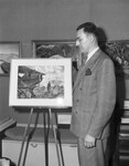 'Overhaul,' a watercolor included in the one-man show of Eugene Clay, artist and chief designer for Globe Aircraft Corporation, whose work may be seen in the gallery of Collins Art Company through May. Clay is standing right next to his paining wearing a suit. His painting is mounted on an easel. There are framed paintings in the background. Published in the Fort Worth Star-Telegram, May 8, 1946.