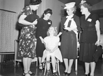 Moslah Temple supporting women are visiting a patient at the Shriners' Crippled Children's Hospital in Shreveport, Louisiana. Left to right, standing, Mrs. J. L. Harris, Mrs. F. C. Johnson, Mrs. Roy Kendall and Mrs. Elmer Harper, with Frankie Bullock, 11, seated. Miss Bullock is wearing a dress and has bows in her hair. She is a patient and has a leg brace on her right leg. [Note: In 1996, Shriners Crippled Children's Hospital was renamed Shriners Hospitals for Children]