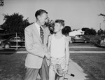 Tennis player Arthur Hoera receiving congratulations from his coach Jack Billingsley after beating Amon Carter Riverside's Jack Scott in a Junior High tennis tournament. Mr. Billingsley and Mr. Hoera are standing outside and shaking hands. Mr. Hoera is wearing a sleeveless shirt and shorts and is holding a tennis racket. Mr. Billingsley is wearing a suit and tie. Published in the Fort Worth Star-Telegram morning edition, May 9, 1946.