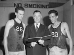 Hub McQuillan, Texas Christian University cage coach, center, talking with new players Bobby Jones, left, and Bruce Craig, right. Coach McQuillan is wearing a suit and is holding an official score book. Mr. Jones and Mr. Craig are wearing their uniforms, numbers 26 and 23, respectively. Behind them is a sign that reads "NO SMOKING." Published in the Fort Worth Star-Telegram evening edition, May 9, 1945.