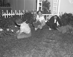 Kneeling left to right, Mrs. Max Farmer, Mrs. E. W. Shine and Mrs. Harvey Patton work on an exhibit for the Fort Worth, Texas Flower Show Festival. They are putting plants and grasses into place. Behind them is a picket fence and various plants. Mrs. Farmer is adjusting a bed of flowers and Mrs. Shine is holding a potted plant. The three women are wearing blouses tucked into trousers.