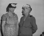 Mrs. L. E. Moran of Liberty, Texas, left, and Mrs. Will Younger of Azle, Texas, right, were among the 20 women honored by the Tarrant County Home Demonstration Club for having been active in home demonstration work in the county for more than 25 years. Mrs. Moran is wearing print dress, a pearl necklace. Mrs. Younger is wearing a striped jacket with a belt. Both women are wearing eyeglasses, floral brooches and hats. They are shown standing against a bare wall and facing toward each other. Mrs. Younger was a member of the first Liberty home demonstration club, organized in 1914. Mrs. Moran, also a charter member of the Liberty club, is president of the organization now. Published in the Fort Worth Star-Telegram evening edition, May 17, 1946.