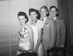 Seniors and juniors of Aledo High School are headed by these officers: standing left to right at an angel, Jimmie Stewart, senior class vice president; Evelyn Towles, junior class vice president; Alex McGlinchey, junior president; and Homer Clyde Norris, senior president. The photograph is taken at their banquet, Miss Stewart and Miss Towles are wearing dresses with corsages, and Mr. McGlinchey and Mr. Norris are wearing suits. Published in the Fort Worth Star-Telegram morning edition, May 10, 1946.