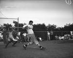 Bob Reed, North Side High School, first baseman takes a mighty swing at bat during a North Side-Tech High School baseball game and connects for a home run in the fifth inning. The catcher is Jerry McKown. There are a few spectators by the fence. Published in the Fort Worth Star-Telegram morning edition, May 10, 1946.