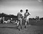 After trotting around the bases, Bob Reed, right, spikes the plate for North Side's fifth run as teammate Dub Cornelius offers congratulations at a North Side-Tech High School baseball game. The Steers won, 10-2. Published in the Fort Worth Star-Telegram evening edition, May 10, 1946.