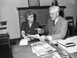 Dean E. E. Davis dictates a letter to his secretary, Miss Ottie Lyon, who has been at North Texas Agricultural College since 1917. They are sitting at a desk. Miss Lyon is wearing a polka-dot dress and Dean Davis is in a suit. On the desk are various documents and a clipboard. Published in the Fort Worth Star-Telegram morning edition, May 10, 1946.