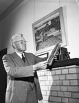 Dean E. E. Davis, North Texas Agricultural College (NTAC), reads the newspaper to keep up with current events. Dean Davis says he believes in life-long learning and studying. He is shown standing by a mantelpiece. Published in the Fort Worth Star-Telegram morning edition, May 10, 1946.
