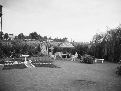 Backyards; Outdoor furniture; Dwellings; Umbrellas; Birdbaths; Johnson, L. E.; Johnson, L. E. (Mrs.); Hedges (Plants); Flower beds; Johnson, Lewis, Jr.; Dunsworth, Dean (Mrs.); Dunsworth, Nancy; Ditto, Jim (Mrs.)