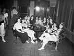 Six couples sitting together having a social hour, left to right, Mr. and Mrs. Hoera, Mr. and Mrs. Colloway, Mr. and Mrs. Rufus Coleman, Mr. and Mrs. Eugene Rutledge and Mr. and Mrs. Homer Roark. The men are wearing Moslah outfit including fez. There is a telephone booth behind them. There is a window next to with blinds next to them. There are some unidentified persons standing next to them.