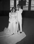 J. W. Stewart, president of the Birdville High School junior class and king of the May Fete, places the crown on the queen, Jeane Francisco. The two are standing in a gymnasium. Miss Francisco is wearing a long-sleeved floor-length gown and Mr. Stewart is wearing a tuxedo. Published in the Fort Worth Star-Telegram morning edition, May 11, 1946.