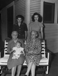Five-month-old Susan Jean Holroid, front came to Fort Worth, Texas with her mother, Mrs. O. J. Holroid of Waco, Texas, back right, for a Mothers' Day reunion with her grandmother, great-grandmother and great-great-grandmother. Her great-grandmother, Mrs. Lucy Church, front right, and her great-great-grandmother, Mrs. Katharine Howe, front left, came here from Hewins, Kansas for the reunion. They are with the baby's grandmother, Mrs. H. B. Evans, back left. All four women are wearing dresses. Mrs. Church and Mrs. Howe are sitting on a bench. The baby is sitting in her great-great-grandmother's lap. There are door and window in the background. Published in the Fort Worth Star-Telegram evening edition, May 16, 1946.