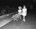 A view of Fort Worth Flower Show Festival and Style Show. Pictured here two young girls, from left to right, are Katzie Waltman and Jane Langdon. Katzie is holding a wheelbarrow carrying flowers and is wearing a dress and a hat. Jane is wearing a crop blouse, skirt. They are walking on the aisle with people sitting in the background.