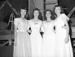 A view of Fort Worth Flower Show Festival and Style Show. Pictured here, left to right, are Mary Jo Dougherty, Our Lady of Victory Academy (OLV); Sue Bender, Texas Wesleyan College (TWC); Penta Jo Price, Texas Wesleyan College (TWC); and Mary McLeod, Texas Wesleyan College (TWC). All the women are wearing light colored dresses and necklaces, except Penta. They are smiling and posing for the camera.