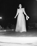 A view of Fort Worth Flower Show Festival and Style Show. Pictured here is Mrs. Hunter McLeon. She is shown walking on the stage. She is wearing an evening gown with frills, a necklace, a bracelet on her right hand and holding gloves on her left.