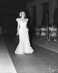 A view of Fort Worth Flower Show Festival and Style Show. Pictured here is Mrs. Hurbert Laney. She is wearing a light colored evening gown, a layered pearl necklace and bracelet, and a hair accessory embellished with flowers. She is holding a dark colored shawl while walking in the aisle. There are people in the background.