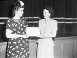 A life long membership in the State Congress of Parents and Teachers is presented to Miss Millicent Keeble, right, principal of Lily B. Clayton Elementary School, by Mrs. Mal Rumph, left, at a meeting at the school. Both women are shown standing in front of a stage. Miss Keeble is dressed in a button-up coat and a skirt. Mrs. Rumph is the outgoing president of school P-TA. She is wearing a dress with floral print, eyeglasses, and a hair brand embellished with flowers. Published in the Fort Worth Star-Telegram evening edition, May 12, 1946.