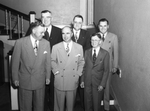 Dealers of Chrysler and Plymouth automobiles were advised at a meeting to stress "parts and services" in their business to keep old cars rolling. Some of the automotive men, left to right, front row, A. J. Wilson, Dallas, Texas district manager; L. M. Tuttle, Dallas, Texas regional manager; and F. G. Weaver, Cleburne, Texas; back row, G. P. Dudley, Comanche, Texas; E. A. Grogan, Weatherford, Texas; and J. T. Inman, Fort Worth, Texas. The men are standing on a stairway, smiling, and are all wearing suits. Published in the Fort Worth Star-Telegram morning edition, May 11, 1946.