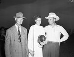 Left to right, J. B. Nelson, Denton, Texas Mrs. R. H. Marshal and Mr. R. H. Marshal, Denton, Texas, are standing together posing for the camera. Mr. Nelson is wearing a suit with a hat. Mrs. Marshal is wearing a dress and holding a rapier on her right hand and a helmet on her left. Mr. Marshall is in a cowboy attire wearing a shirt, trousers and a hat. He is staring at Mrs. Marshal.