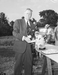 Colonel (Col.) Merl L. Buckner, Dallas, Texas is helping himself with some snacks. He is holding a plate as he looks at the camera. He is dressed in suit and tie. He is wearing eyeglasses and holding a walking stick. There is a table next to him with snacks and a hat. There are few men with hats and a van in the background.