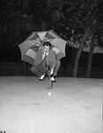 Henry Picard, pro Golfer of the Canterbury Club at Cleveland, Texas, got in a few holes at Colonial in the rain. He is lining up his putt on number three. He is wearing a sweater, trousers, golfing gloves and shoes. He is holding an umbrella in one hand and a golf club in the other hand. Published in the Fort Worth Star-Telegram evening edition, May 13, 1946.