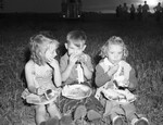 Denton County Pointer and Setter Club Barbecue. These Three cousins, Jowanna Gregory, Tony Allen Riley and Sarah Florine Roach, all of Denton, Texas, were guests at Tom Cole Ranch. Proceeds from the barbeque will pay for the club's summer camp for boys at Lake Dallas. Three children are sitting on the grass with plates of food on their laps as they pose for the camera. There are silhouettes of people in the background. Published in the Fort Worth Star-Telegram evening edition, May 12, 1946.