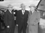 Three men pictured.Here are Robert G. LeTourneau (center), Grover C. Cole, left, and Mayor Carnrike, right. Robert J. LeTourneau, industrialist and evangelist is welcomed at Municipal Airport Saturday afternoon when he arrived for three speaking engagements on his practical Christianity. He addressed the Tarrant County Baptist Brotherhood Saturday night, and will be speaking at the Polytechnic Methodist Church Sunday morning and at a mass meeting at North Side Coliseum Sunday afternoon. He is being greeted by Grover C. Cole. and Mayor Carnrike. Three men are standing at the airport and engaged in a conversation. All are dressed in suits and ties, and hats. Published in the Fort Worth Star-Telegram evening edition, May 12, 1946.