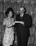 The Texas Christian University (TCU) Women Exes at a luncheon meeting Saturday at Glen Garden Country Club presented a check of $150 scholarship check to the university. Mrs. C. I. Clark, Exes president, is shown handing the check to Mr. M. E. Sadler, TCU president. Mrs. Clark is wearing a printed dress and hat as she hands the check to the president. Mr. Sadler is wearing suit. Both are standing in front of a curtain. Published in the Fort Worth Star-Telegram evening edition, May 12, 1946.