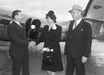 Standing outside next to a plane are Reverend Grady Guyton, left, giving a warm welcome and shaking hands with Mrs. R. G. Le Tourneau while R. G. Le Tourneau looks on. Reverend Guyton and Mr. Tourneau are wearing suits and Mrs. Tourneau is wearing a blouse, blazer and skirt and is holding a purse and pair of gloves. The plane in the background has the R. G. Le Tourneau Inc. name on it and visible on the tail reads "Lockheed."