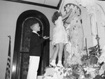 Dianne Manon Seuzeneau, 8, right, daughter of Mr. and Mrs. George L. Seuzeneau, crowned the image of Virgin Mary in a ceremony at Holy Name Catholic Church in which children of the church school took part. Billy Allen, left, was the bearer of the crown of flowers. Dianne is wearing a light colored dress, standing on the table and is stretching her arms to reach to Virgin Mary's image to crown her while Billy watches her from behind. Billy is wearing a suit and a bow tie. Published in the Fort Worth Star-Telegram morning edition, May 13, 1946.