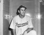 Eldon Muratore is the 26-year-old catcher with the Beaumont Exporters. He hits clean-up for the Exporters and is on fire this spring with a.350 average. Muratore is an ex-teammate of the Fort Worth Cats' knuckleballer, Willard Ramsdell. Muratore collected two hits against his former pitcher when they last faced off. Muratore is posing in front of a door wearing Beaumont's road uniform.