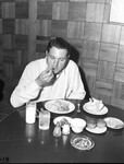 Pictured here is golfer Johnny Bulla. He is shown seated at a dining table in a room and enjoying meal. He is wearing a light colored full sleeved shirt. Published in the Fort Worth Star-Telegram morning edition, May 14, 1946.