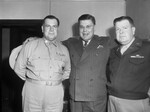 The three Hagman brothers of Weatherford, Texas, left to right, Lieutenant Colonel William L. Hagman, former Lieutenant Colonel Ben J. Hagman and Major Carl O. Hagman, recently held their first reunion in six years and swapped stories of their army service in various parts of the world. Col. William Hagman and Major Carl Hagman are in their military uniforms while Ben J, Hagman wearing a striped suit. Published in the Fort Worth Star-Telegram evening edition, May 15, 1946.