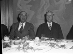 Milton Daniel, left, and Doctor L. D. Anderson attend a dinner for the Texas Christian University (TCU) expansion campaign. Mr. Daniel is a member of the Texas Christian University board of trustees and Doctor Anderson is the president of the board. The men are sitting a table and are both wearing suits. On the table are plates, bowls, cups and utensils. Published in the Fort Worth Star-Telegram morning edition, May 14, 1946.