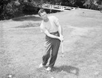 Pictured here is golfer Jimmy Demaret of Houston, Texas. He is wearing a striped T-shirt and trousers. He is caught in action as he makes the putt. Jimmy unlimbers his eight iron, although he vows the long Colonial course will give him little chance to use the short club. Published in the Fort Worth Star-Telegram evening edition, May 15, 1946.