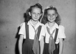 Fort Worth Happy Valley Bluebird group has added its name to the list of contributors to the Star-Telegram Baby Hippo Fund. Cleta Marie Sprinkle, left, and Alice Ann Grove, two members of the Happy Valley Bluebird Group, are pictured here. They added $2 in the group's name to the fund to buy Forest Park a baby Hippo. The two girls are standing in front of a bare wall, dressed in uniforms and smiling for the camera. Published in the Fort Worth Star-Telegram evening edition, May 15, 1946.