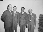 New officers of Texas Automotive Dealers Association are pictured here. Auto dealers officers, left to right, are John Holt, Abilene, Texas, second vice president; W. G. Alderson, Lubbock, Texas, third vice president, I. W. Walls, Dallas, Texas, president and W. A. Williamson, San Antonio, Texas, first vice president and general manager. They were elected at the association's convention which ended here on Tuesday. All the men are wearing suits and standing against the wall next to a stack of folders and smiling at the camera. Three of them are wearing TADA's (Texas Automotive Dealers Association) badge. Published in the Fort Worth Star-Telegram morning edition, May 15, 1946.
