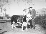 Stuart Henderson shown with his grand champion steer, "T-O Atomic", an 810-pound Hereford steer. Henderson exchange greetings with C.A. Lupton, the bidder on the champion for Cola-Cola Bottling Company.