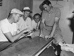 Four golfers are pictured here. In the locker room at Colonial, from left to right, are E. J. (Dutch) Harrison, Raymond Gafford, Herman Barron and Johnny Bulla. They are talking over the clubs. Harrison is holding a club and talking as the others listen to him. Harrison and Gafford are wearing caps. Barron is wearing a shirt with a necktie and Bulla is wearing a checkered shirt and trousers. Gafford is pro at Ridglea Country Club. The others are playing in the $15,000 Invitation. There are lockers and a clothes hanger in the background. Published in the Fort Worth Star-Telegram evening edition, May 16, 1946.