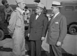 Pictured here, from left to right, are Colonel (Col.) Bruce K. Holloway, Homer Covey and William Holden. Colonel (Col.) Holloway is speaking and other two men are listening to him. Covey and Holden are wearing button-up suits, ties and hats while Holloway is wearing a military uniform. Three men appear to be in Fort Worth Army and Air Force air base. There are some military personnel in military uniforms and also military automobiles in the background.