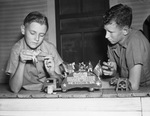 Don Alexander, left, and Jack Reams Junior shown putting the finishing touches on new figurines for the miniature circus display which occupies a room at Don's home. Don is painting one of the figures and Jack is holding another figure. Both boys are wearing short-sleeve, collared shirts. Some of the miniature pieces include flags, a truck and an elephant.