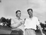 Golfers Reynold Smith and Harry Todd standing in a golf course. Smith is wearing shirt, trousers and his holding a golf ball. Todd is wearing a collared shirt, trousers and is looking at Jimmy. Todd is among the 24 star professionals in the Colonial Club $15,00 national invitation golf tournament, playing 18 holes for each of the next four days. Published in the Fort Worth Star-Telegram morning edition, May 16, 1946.