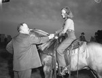 A partial view of Johnson County Dairy Show and Rodeo. Fort Worth business men and officials of the Southwestern Exposition and Fat Stock Show received a hearty reception when they arrived in Cleburne for the Johnson County Dairy Show and Rodeo. In this picture W. R. Watt, newly elected president of the Fort Worth stock show, greets Mary Lee Bridges of Glen Rose, Texas, who rode in the Ceburne parade on Booger Bear, the champion stock horse at the March show in Fort Worth, Texas. The horse is owned by her father, Jack Bridges, Palomino and Quarter horse breeder. Mr. Watt is shaking hand with Mary. He is dressed in suits. Mary is in a cowgirl attire and shown seated on a horse. There is an unidentified cowboy on a horse in the background. Published in the Fort Worth Star-Telegram morning edition, May 17, 1946.